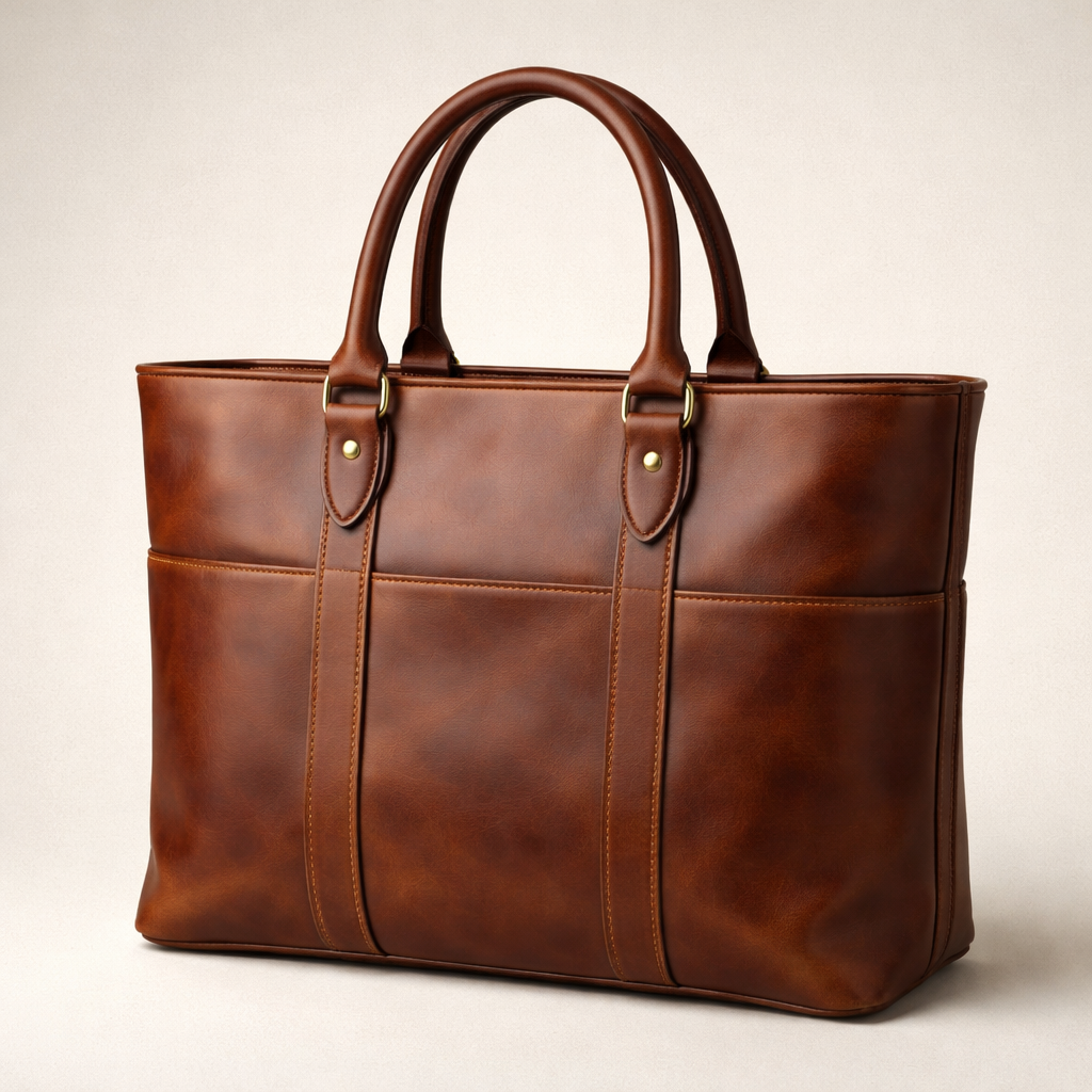 Make me a non gender specific leather tote bag with rolled handles