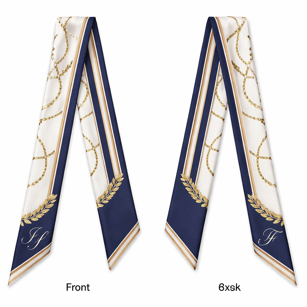 Design a silk scarf thanks 5x 86cm to be wrapped on the handle of a purse. This is for a collegiate graduation ceremony. No logos or any school relation. Let’s make it simple and tailored. Let’s have JF be the initials. It’s like a sorority social club, classic style, show front and back