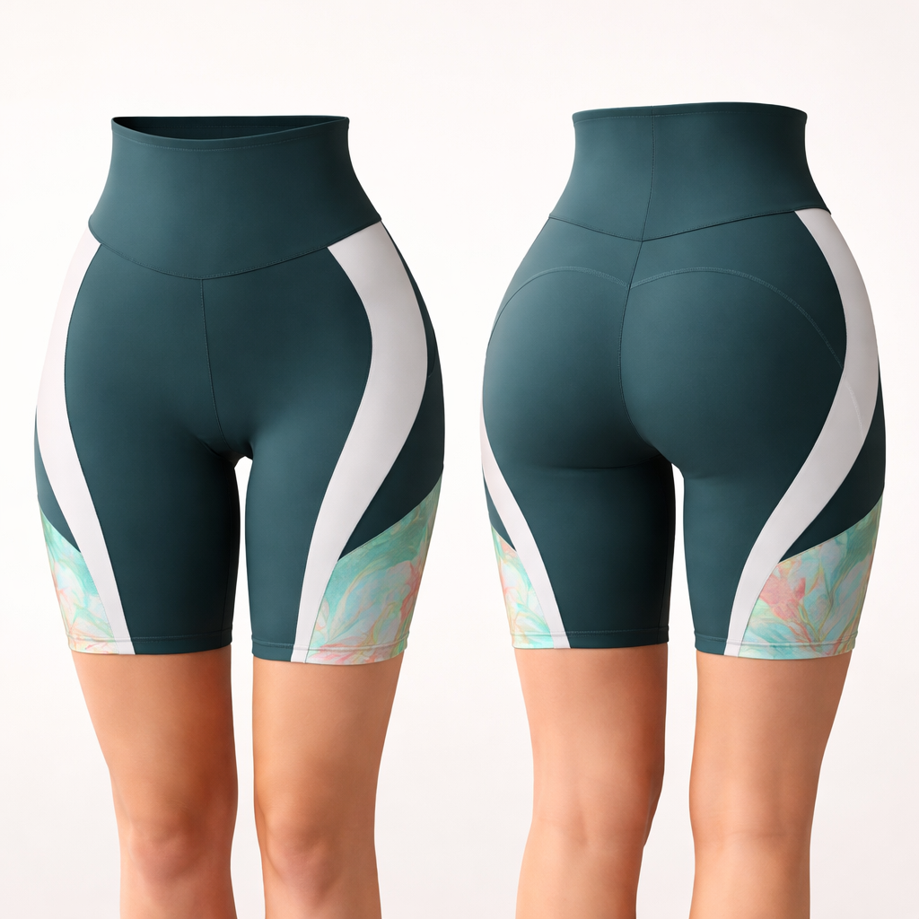 • garment: biker shorts / cycling shorts • fit: high-waisted, sculpting, compressive • length: mid-thigh • style: luxury activewear / fashion sport • view: front and back Women’s premium cycling shorts, high waist, mid-thigh, contouring fit. Main fabric in Revolutional Sweet Matinna 70245. White curved insert in Vita Power Bianco visually elongating the leg and sculpting the hip line. Hampton Pappagallo 70136 inserts placed at side lower thigh and lower outer back thigh. Back construction emphasizes rounded glute contour with curved seam lines and lifted shaping effect. Elegant technical activewear, refined color blocking, front and back garment mockup. , sporty style, show front and back