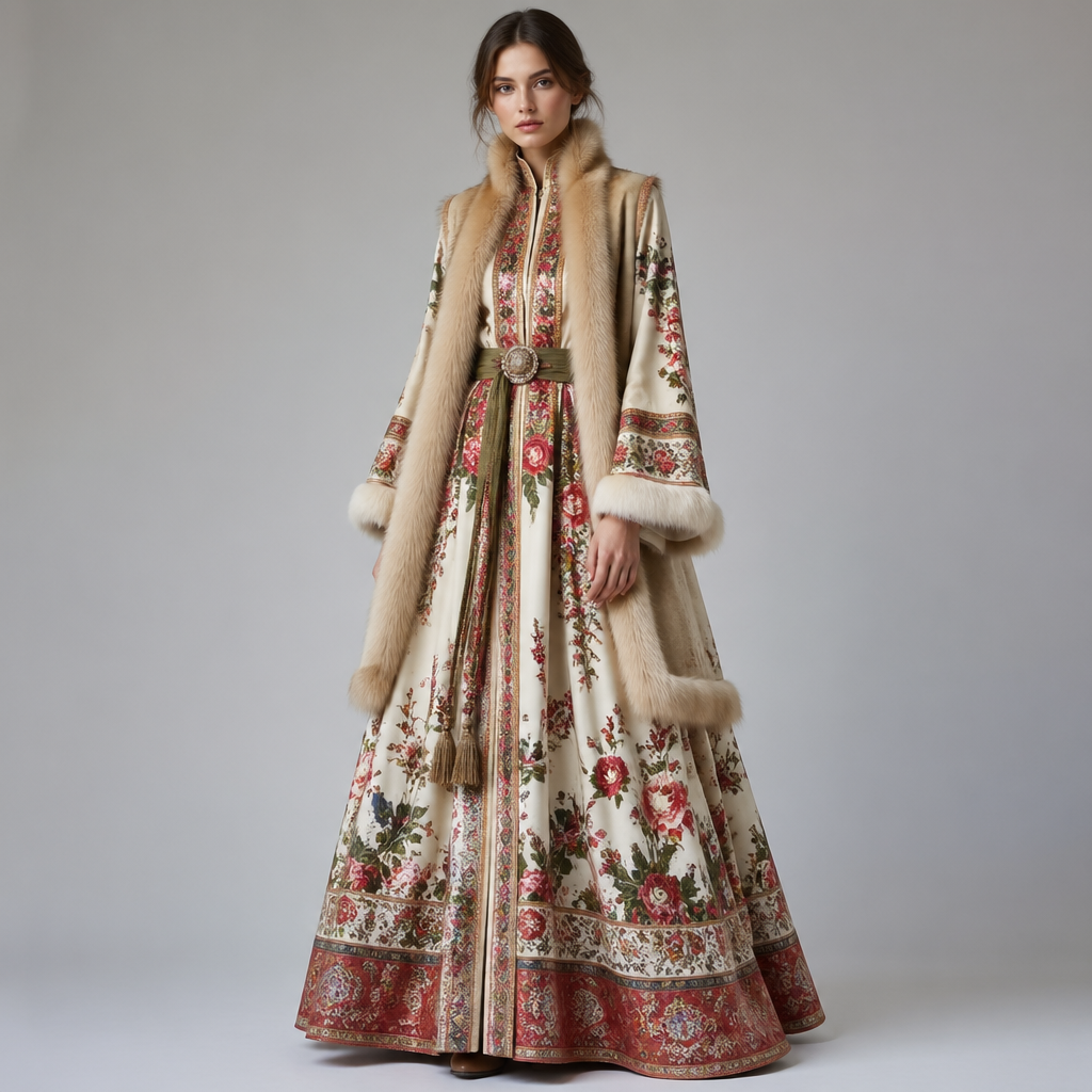 photorealistic fashion design, A Female Dress design, suitable for Spring. Consider Russian fashion — fur and layering traditions, bold patterns, mix of European elegance and Slavic folk motifs. Current season is Spring in Russia., just the design no text