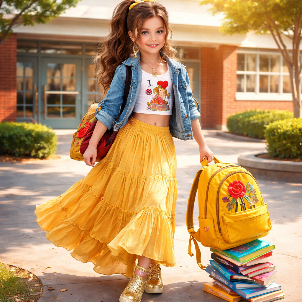 6th grade girls Disney princess bell school look a crop top that says I ❤️ books and a long skirt and golden heals jean jacket with a rose on the back and a yellow backpack with 5 books falling out , streetwear style