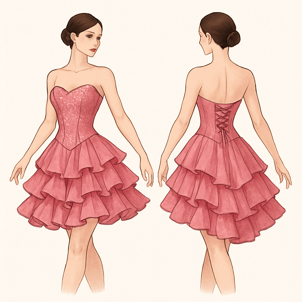 Rose pink dress with a ruffle skirt and a corset with sparkles , dance style, show front and back