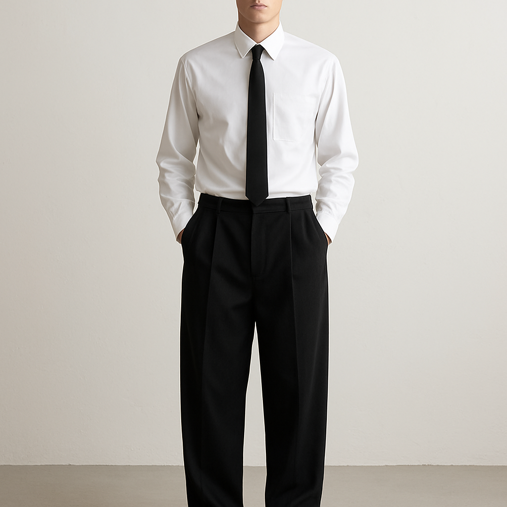 White plain long sleeve shirt with black button up underneath and oversized black sweats bottoms and add a tie and show collar, show head to toe, business style