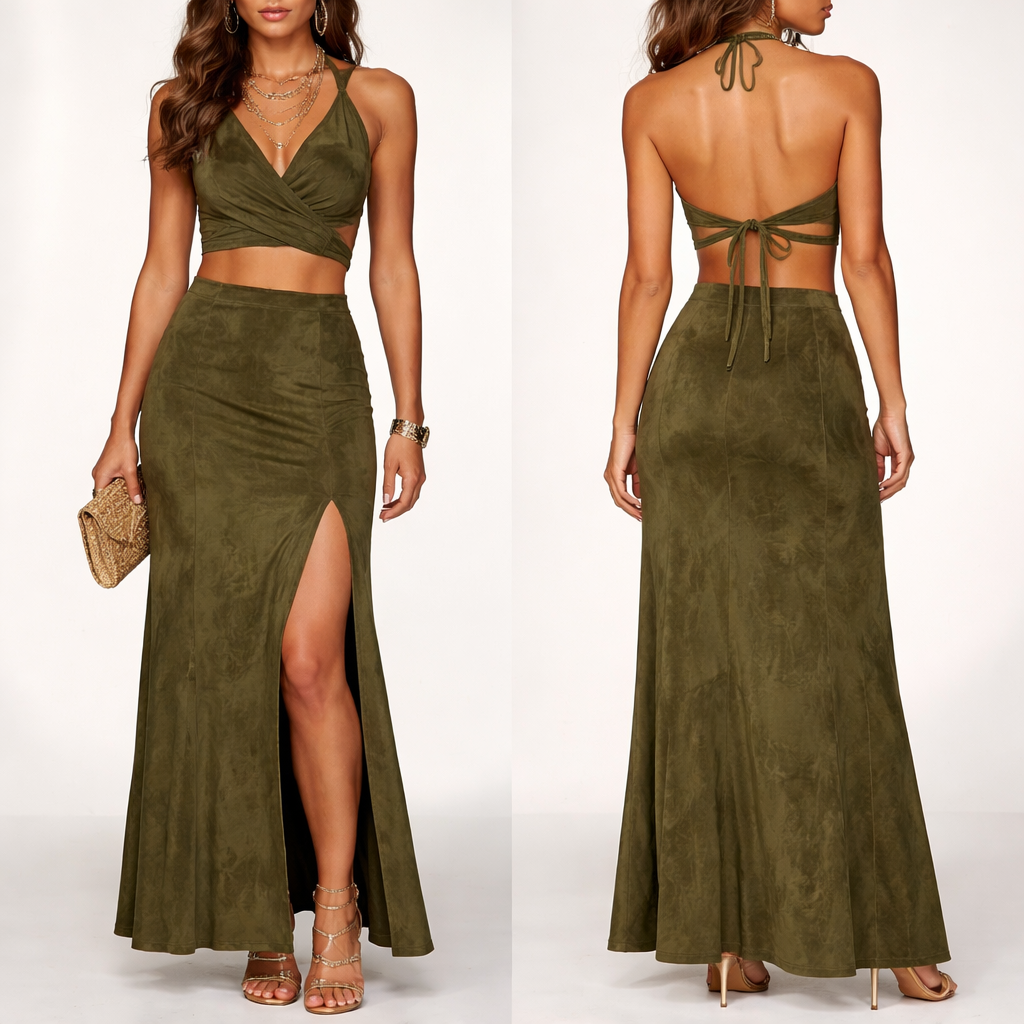 The centerpiece is an olive green, heavy-suede maxi skirt with a raw, unfinished hem that drags just slightly. We’re pai...