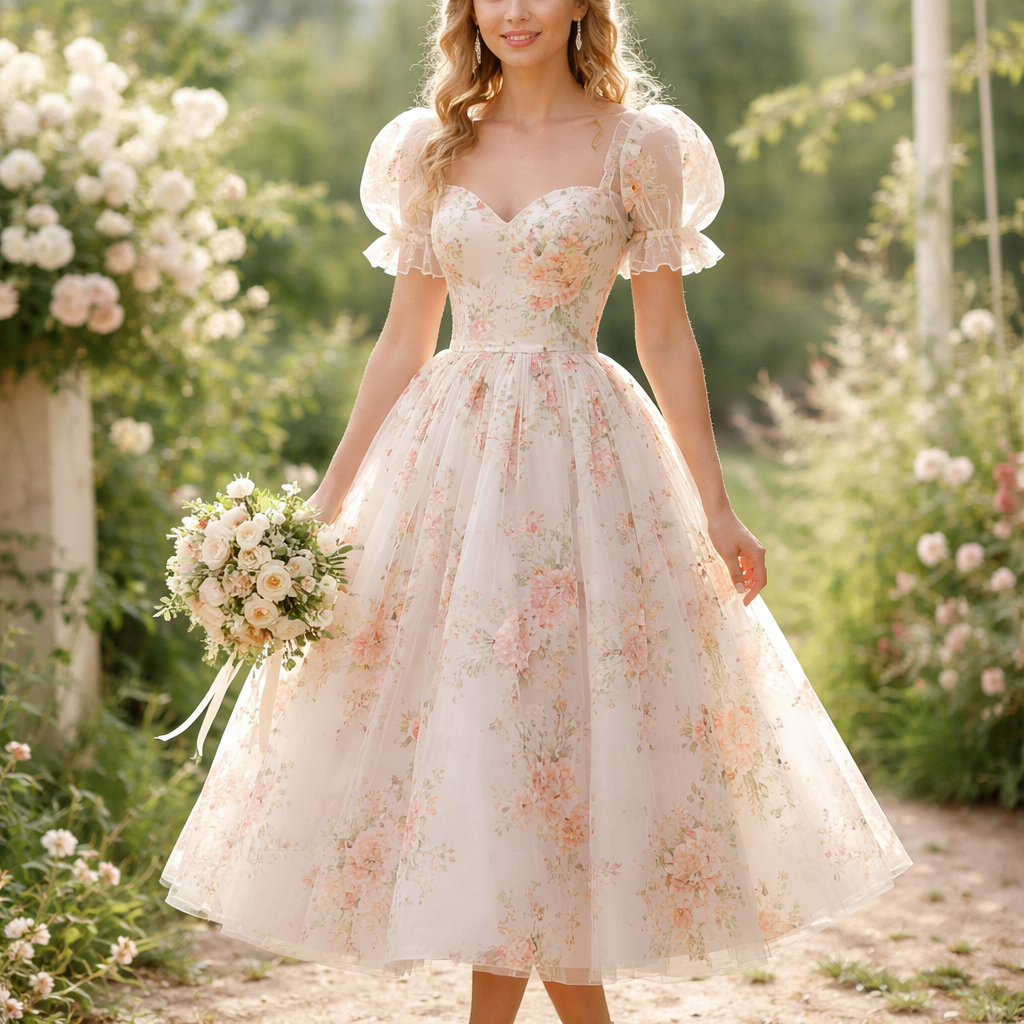 Floral wedding dress tea length with puffed sleeves higher top