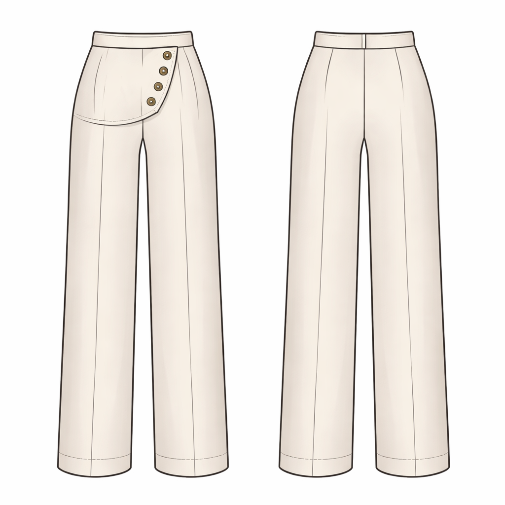 Sailor trousers MASTER BLOCK – FRONT (CAD FOUNDATION) SILHOUETTE & PROPORTION High-rise waist (natural waistline) Straight grainline, perpendicular to hem Wide straight leg from hip to hem (not flared, not tapered) Full-length leg (hem at ankle level) WAIST & OPENING (NEUTRAL) ☐ Straight waistband (separate piece) ☐ Waistband height: standard tailored depth ☐ No visible fastening (internal closure placeholder) ☐ Centre front line drawn but no fly detail (This allows sailor flap, lace-up, or hidden zip to be overlaid later) FRONT SHAPING ☐ No pleats ☐ No darts ☐ Hip shaping resolved through side seam ☐ Clean front panel POCKETS (REMOVED IN MASTER) ☐ No pockets drawn ☐ Pocket notches NOT included (All pockets added via overlays) HEM ☐ Clean straight hem ☐ No cuff indicated MASTER BLOCK – BACK (CAD FOUNDATION) SILHOUETTE & PROPORTION High-rise back waist Straight leg mirroring front width Full-length hem BACK SHAPING ☐ Centre back seam ☐ Back waist dart OR shaping integrated into CB seam ☐ No yoke POCKETS (REMOVED IN MASTER) ☐ No back pockets ☐ No pocket placement marks WAIST ☐ Straight waistband continuation ☐ No belt loops OVERLAY FOR THESE PANTS: OVERLAY A: CLASSIC SAILOR FLAP (RIVIERA / PURIST) FRONT OVERLAY ☐ Asymmetrical sailor flap extending from centre front ☐ Curved flap edge ☐ 3–4 button placements along wearer’s right side ☐ Button circles added ☐ Curved inset pocket added beneath flap BACK OVERLAY ☐ No changes ☐ Optional removal of back dart for cleaner look, retro style, show front and back