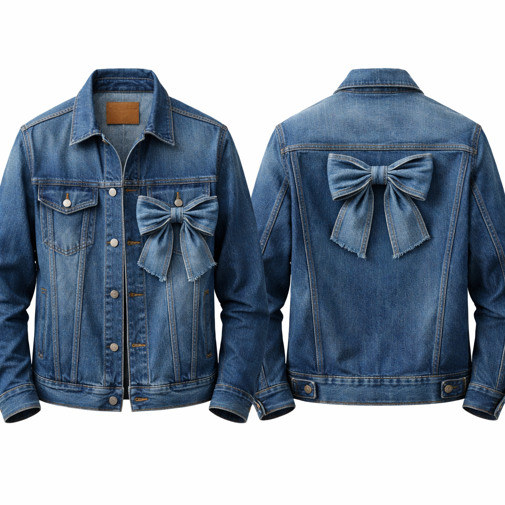 A denim jacket for a malewith a flap pocket and bow on it