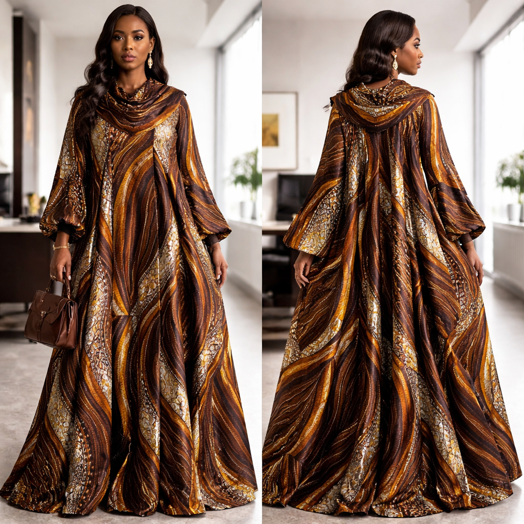 Crée une robe longue soft et élégante en tissu dampé premium. Le style doit être chc robe ample africain