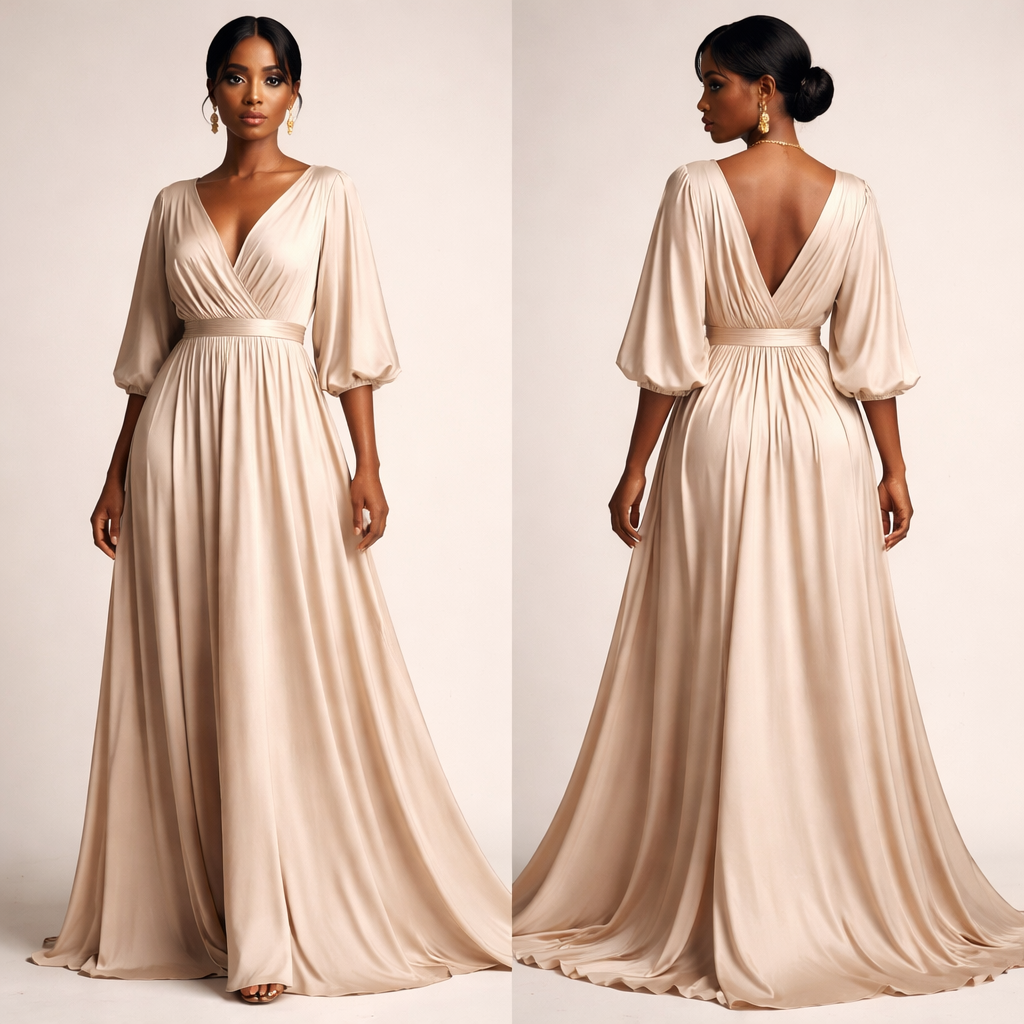 Crée une robe longue classe, soft et élégante en tissu dampé premium. Je veux une coupe fluide et raffinée avec une sil...