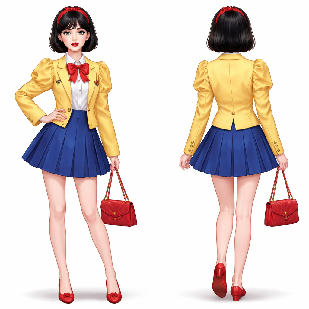 A girl with ebony black hair and a short bob and fair skin and red lips has a yellow Blazer with puff sleeves and a royal blue skirt with a red headband and red ballerina slippers and a red bag , school_uniform style, show front and back