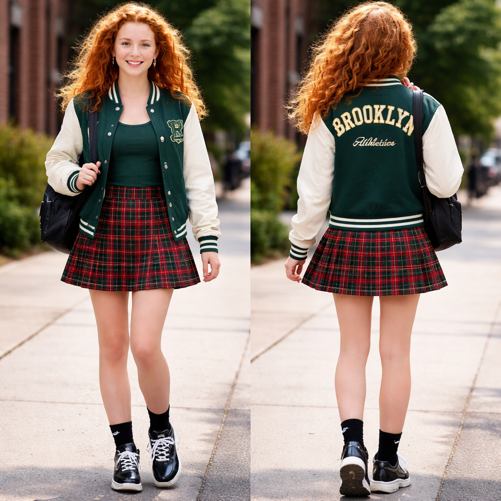A 16 year old teenage girl with a European face and natural curly red hair wears forest green top and a jacket and Scottish pattern skirt and black sneakers , varsity style, show front and back
