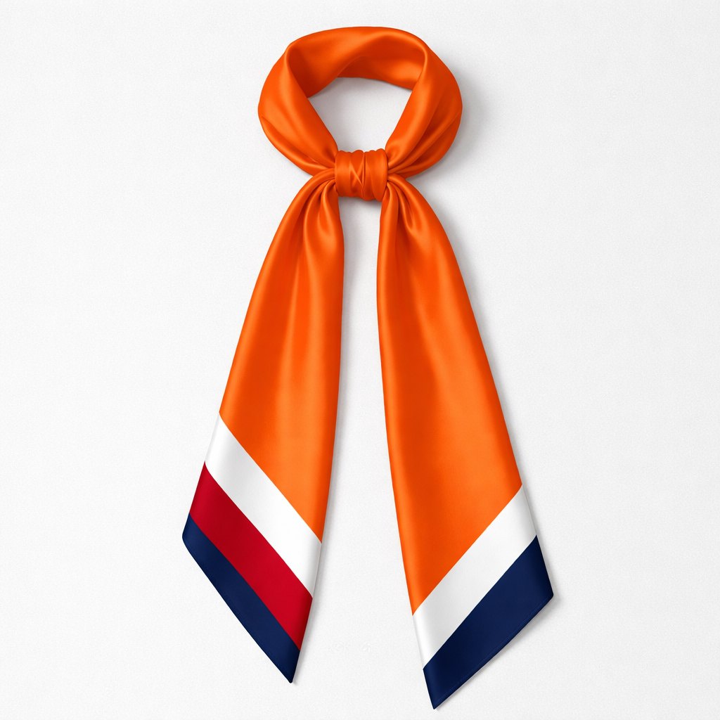 Design a silk scarf that is 5x86cm that is Netherlands colors for their soccer team for the World Cup 2026. Just colors no logos. Just bright iconic orange with no accent colors angled corners add a touch of navy. That’s too dark. Now a little bit of white, classic style
