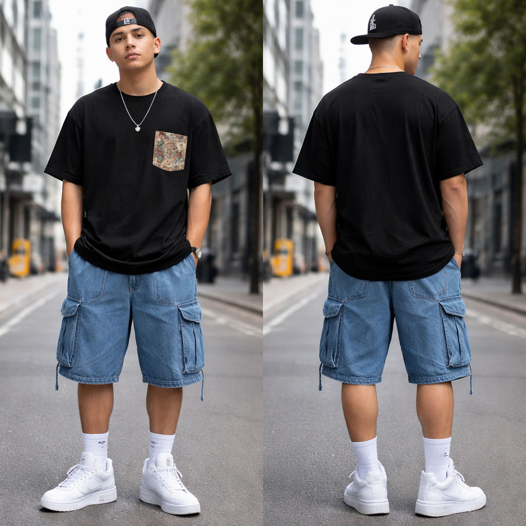 Black T-shirt with A vintage print breast pocket paired with a a denim cargo shorts white socks and white air force one sneakers with a black SnapBack cap , streetwear style, show front and back