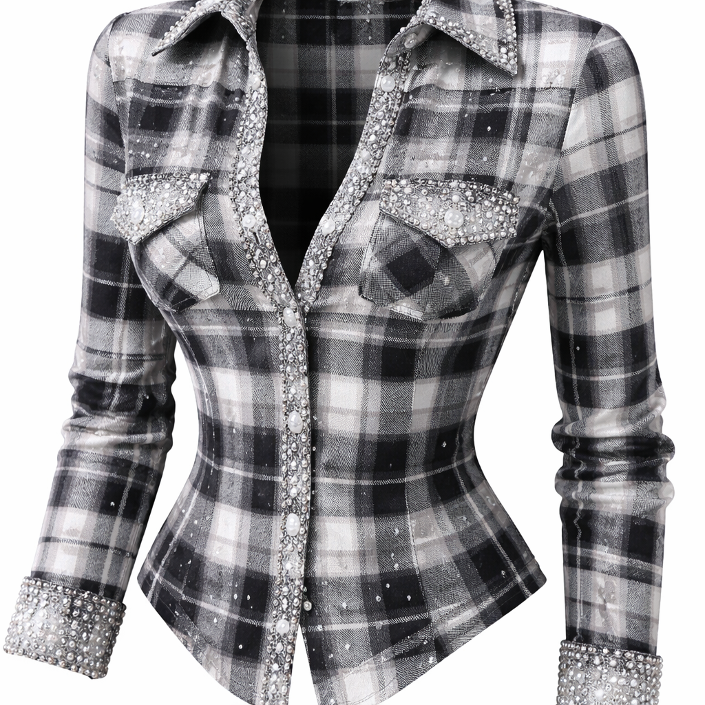 a checkered shirt with small pearls and diamonds, a nice cut, not baggy, more Y2K style, so it has a lot of swag, gray, white, and black