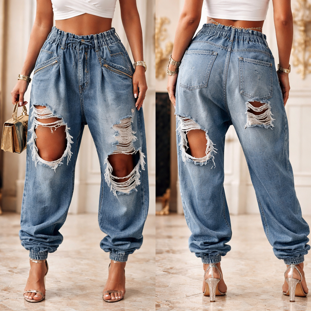 Harem Pants Loose Pleated Solid Color Jean Pants Bottoms Drop holes , luxury style, show front and back