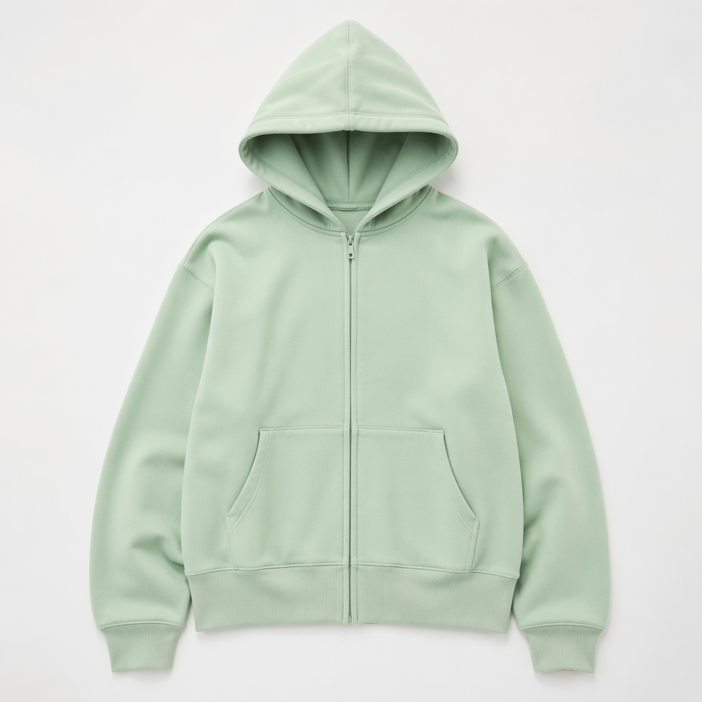 photorealistic fashion design, photorealistic fashion design, A Unisex Top design, in Casual style. Zip-up hoodie. Seamless, soft fabric, navy, everyday use, no tags.. Sweden fashion aesthetics., casual style, just the design no text. Refinement: Make it pastell green instead. , just the design no text
