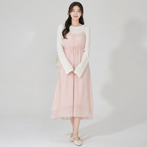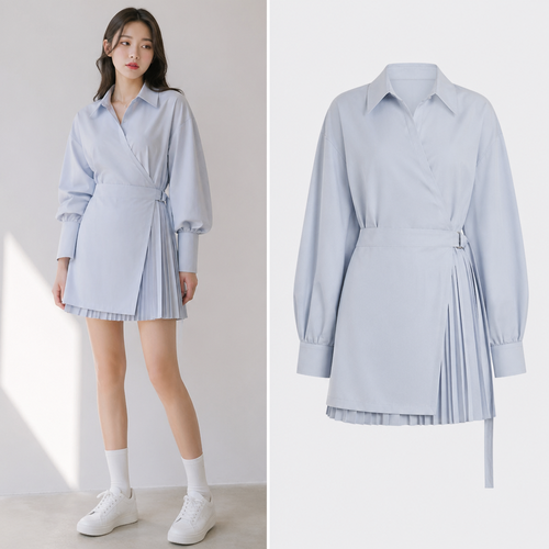 A Female Dress design, suitable for Spring. Consider Korean fashion (K-fashion) — clean lines, oversized fits, layered s...