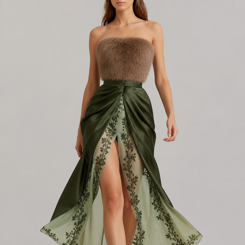 A Female Dress design, suitable for Spring, in Casual style. the chest area is is light brown fur and the hip/waist area is dark green sateen, and the opening between the legs is light green chiffon with flowry dark green laces. SY fashion aesthetics.