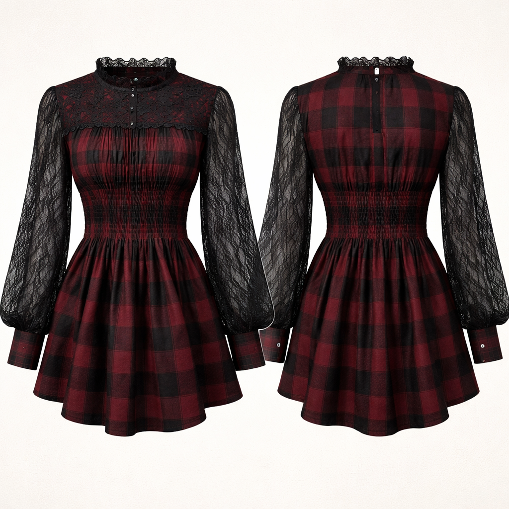 This garment is a longline smock-style tunic that reaches mid-thigh or hip-length, designed for a sophisticated winter holiday look. Fabric & Pattern: Use a dark red and black plaid (such as a deep Tartan or Buffalo check) in a medium-weight fabric like a cotton-elastane blend for slight stretch. Body & Fit: The bodice features intricate smocking—an embroidery technique that gathers fabric into tight pleats—around the waist or chest to create a form-fitting silhouette that remains flexible. Below the smocking, the fabric should flare into a loose, flowing drape to provide comfort and movement. Sleeves: Long, contrasting lace sleeves in black add a formal, "not too Christmasy" touch. Consider a Bishop sleeve or small balloon style that gathers at the wrist with a plaid-trimmed cuff to tie the look together. Neckline: A ruffled crew neck or a subtle V-neck with lace detailing can elevate the piece for a party setting. Suggested Product Styles If you are looking for ready-made items that closely match this description, consider these options: Red Thin Waist Plaid Stitching Layered Lace Gothic Shirt Features: According to Lolitainside, this features a fitted waist with a center back cord for adjustment and layered lace stitching on the chest. Sleeves: Small balloon sleeves with narrow cuffs. , show front and back