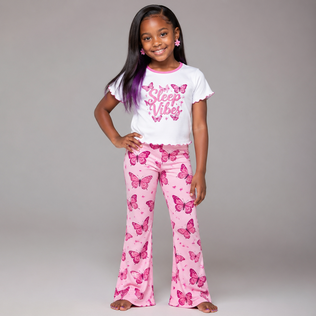 photorealistic fashion design, A black skin 9 years old with a straight hair painted purple toe nails and flower earrings and a white pajama shirt that says sleep vibes with butterflies and pink flare pajama pants with hot pink butterflies girl shirt says sleep vibes straight hair paint purple toenails flowers earrings super young looking but 9 years old shirt says sleep vibes , sleepwear style, just the design no text