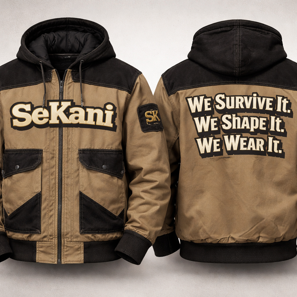 SeKani written on the front across the chest On the back my slogan will read “We Survive It. We Shape It. We Wear It.” SK on the sleeve , workwear style, show front and back
