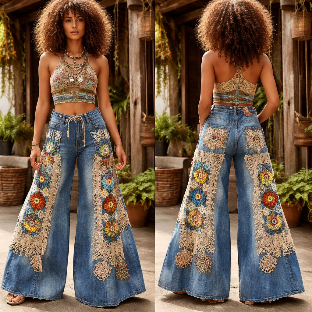 Wide leg pants, crochet, upcycled from 3 pairs of jeans, unique, avant garde, folk style, show front and back