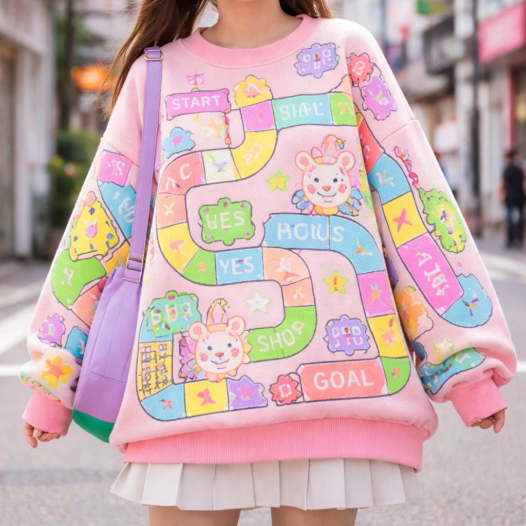 Japanese Street fashion design: Oversized, boxy cotton sweater with vibrant neon colors in a playful board game graphic. Cute and casual, perfect for layering.