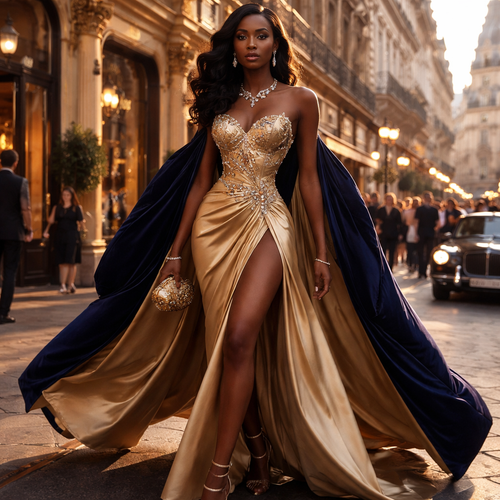 “Generate a luxurious Somali-inspired bridal evening gown with a fitted mermaid silhouette, modest but figure-flattering...