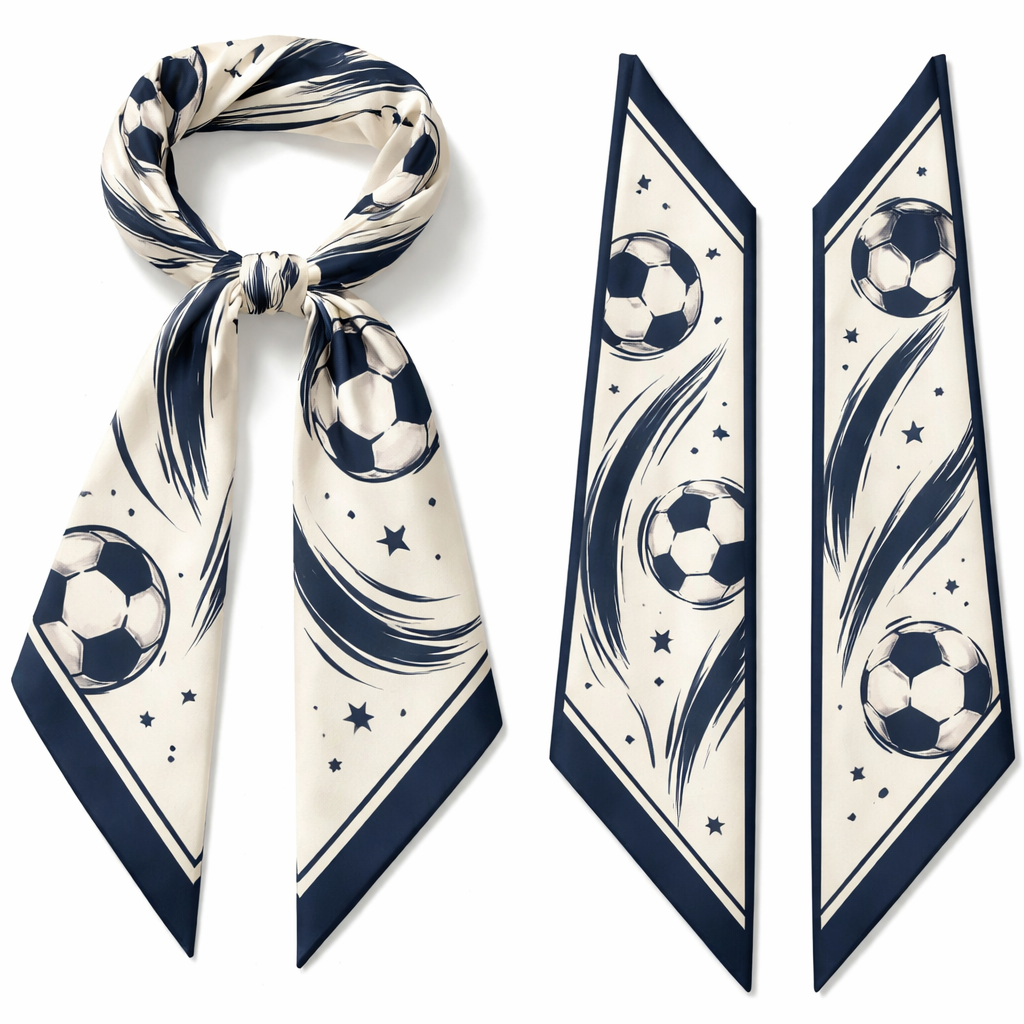 Design a silk scarf that is 5x 86cm with oblique edges. Make it an abstract soccer theme. Super simple . Make the soccer balls abstract. Use ivory and black or navy. , classic style, show front and back