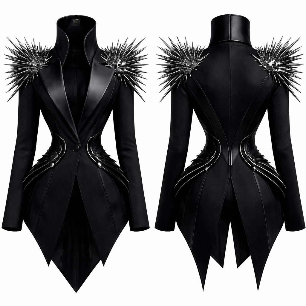 crea un blazer che abbia delle spalle appuntite e delle borchie lunghe oppure delle spine che possono essere anche di un altro materiale sulle spalle ad imitare la deve definire la vita, deve anche essere molto imponente, audace avere un revers appuntito, aguzzo e una collo cilindrico, tipo armatura o per colare, show front and back