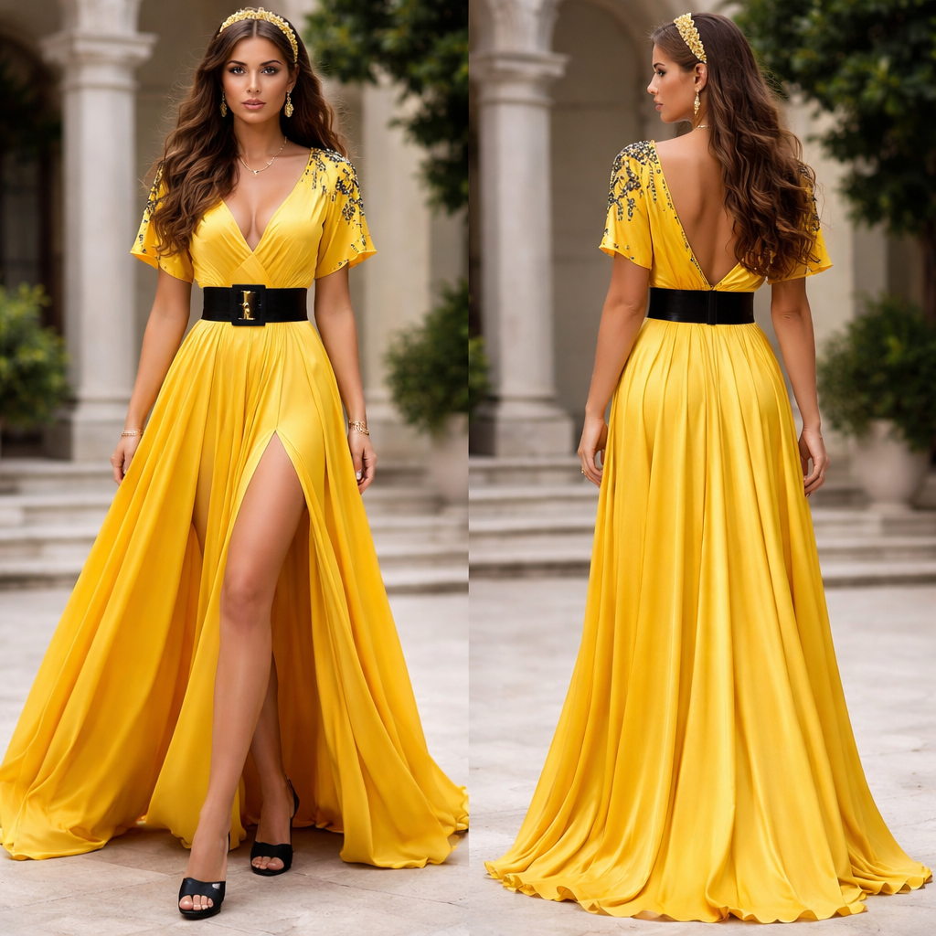 Create for me a dark yellow bright colored dress that opens ’ mid thigh and falls to the feet. A heavy flowy dress with short sleeves made with black thread instead of yellow. Thick black belt. Black short heel sandals with no straps. Long flowy hair with a yellow sparkly headband. , formal style, show front and back