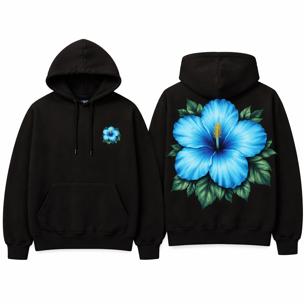 A black Hoodie with a blue hibiscus flower on the back and a small one on the right side on the front, show front and back