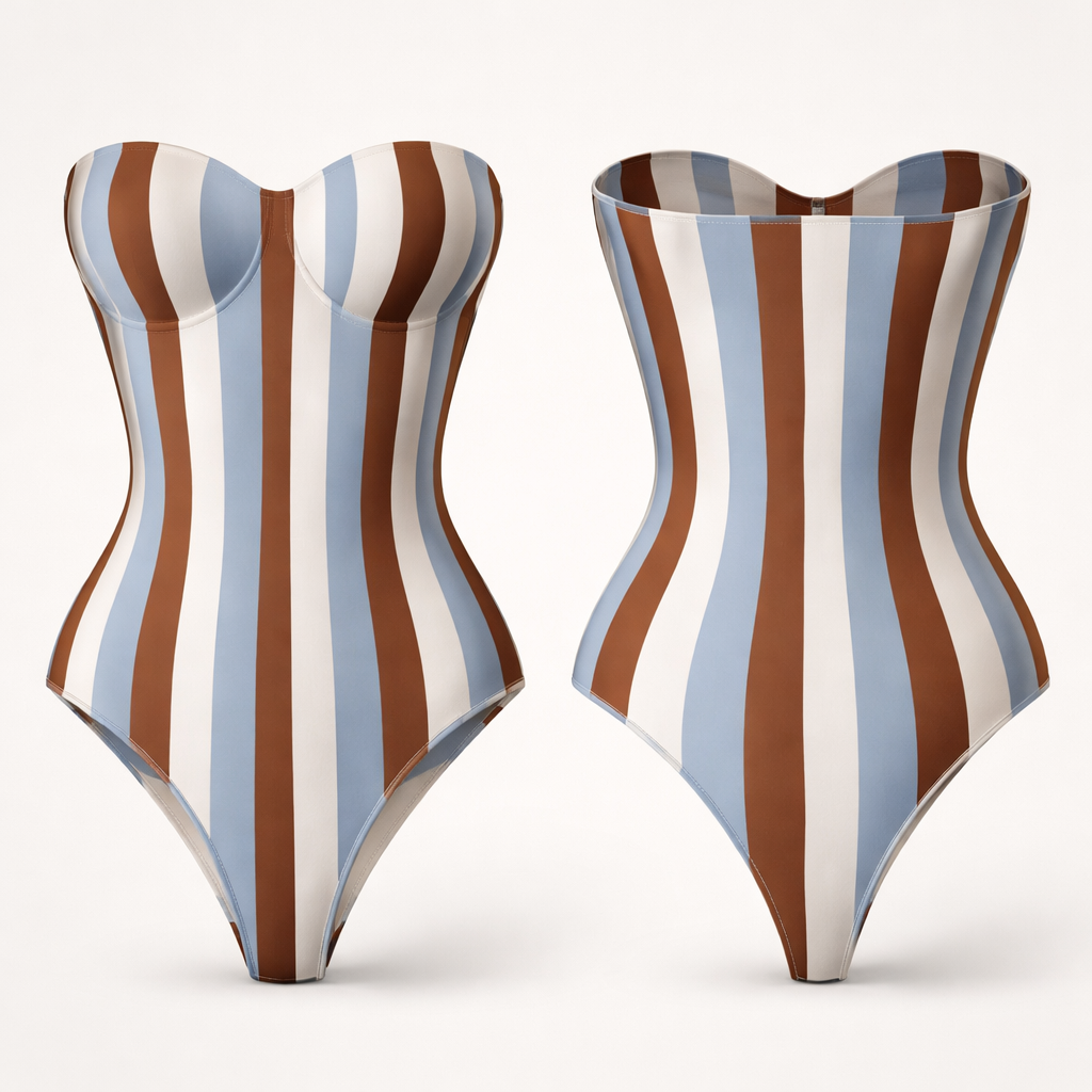 Bodysuit shape wear g string no ai model strapless no lines just no bow just string and no back open no ruffles stripes brown blue and white, classic style, show front and back