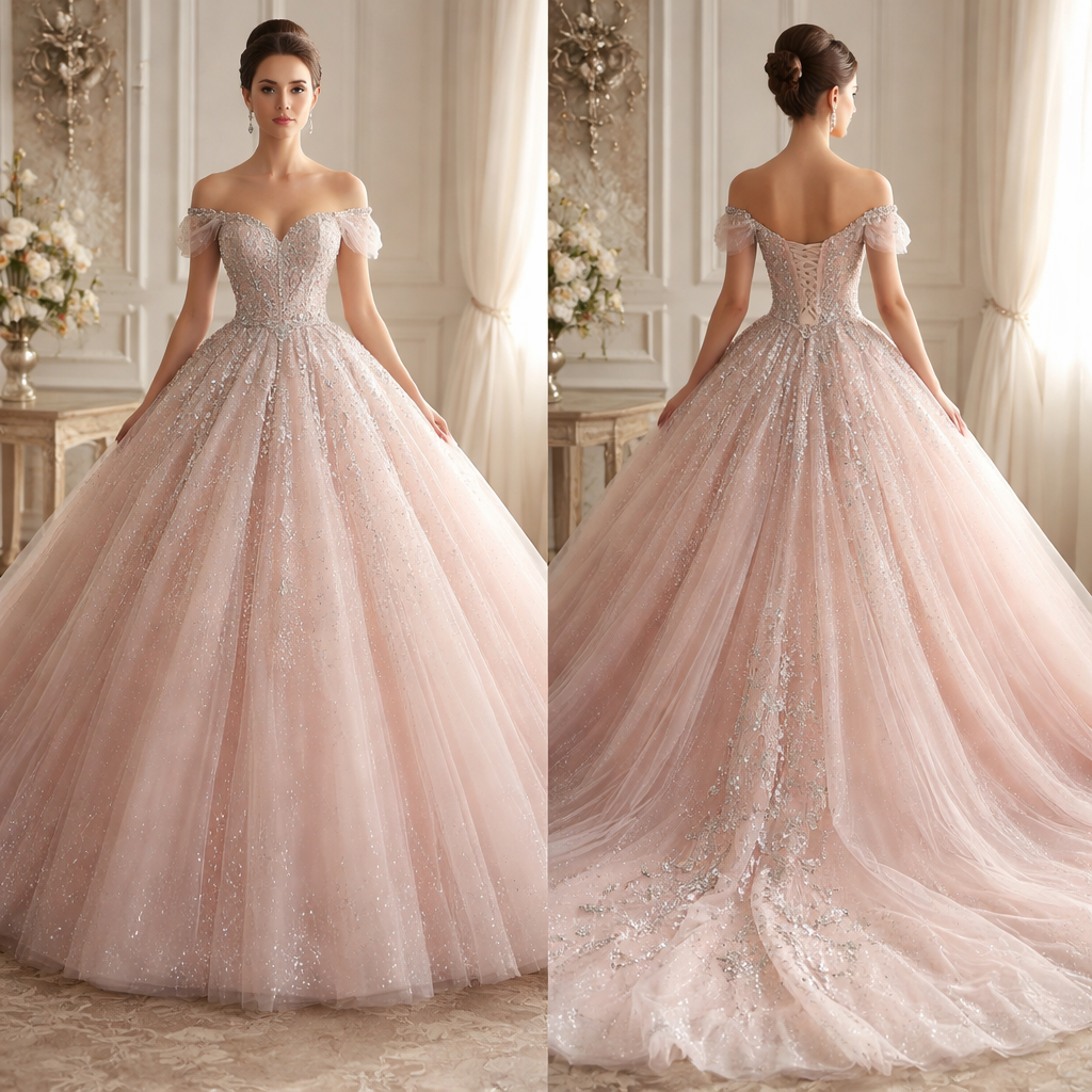The gown begins with a structured ivory satin bodice, smooth and luminous, catching the candlelight with a soft, warm g...