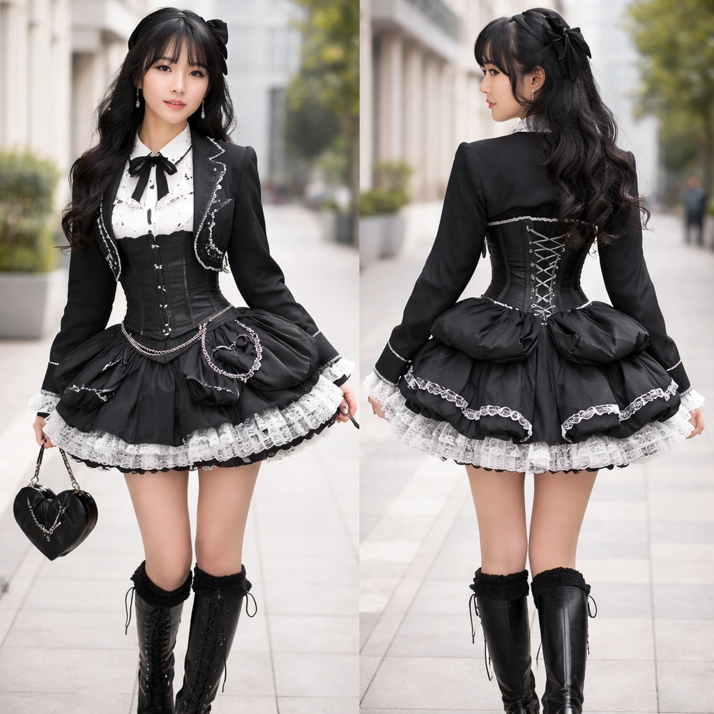 Real clothes, street clothes, modern, cute, with puffy vintage bustle, monochrome style, show front and back