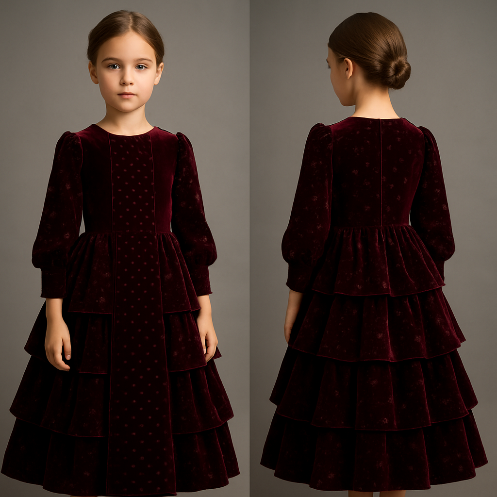 Design an elegant girls’ long dress inspired by luxury couture. Use the polka dot velvet fabric in the center front panel of the dress, running vertically from neckline to hem in a clean, straight silhouette. Apply the star-embellished velvet fabric on the layered skirt tiers and the sleeves, creating soft cascading layers with rich texture and subtle shine. The dress should have a modest, refined cut suitable for special occasions, with balanced proportions, premium tailoring, and a sophisticated finish. Color palette should remain deep burgundy and plum tones, highlighting contrast between the dotted fabric and the star-embellished fabric. High-end fashion photography, realistic fabric texture, studio lighting, luxury children’s couture style. , show front and back