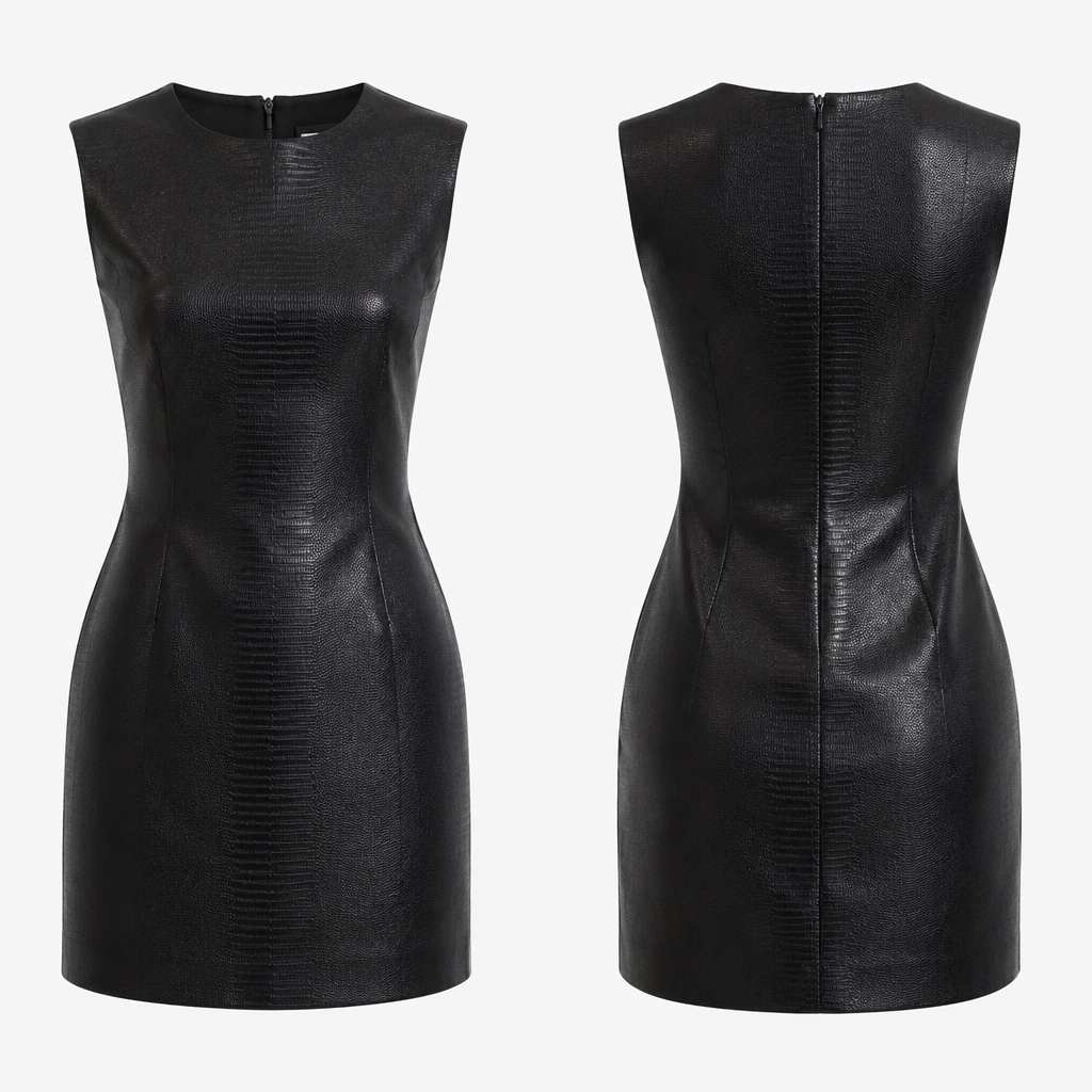 photorealistic fashion design, Short dress black lizard, classic style, just the design no text, show front and back