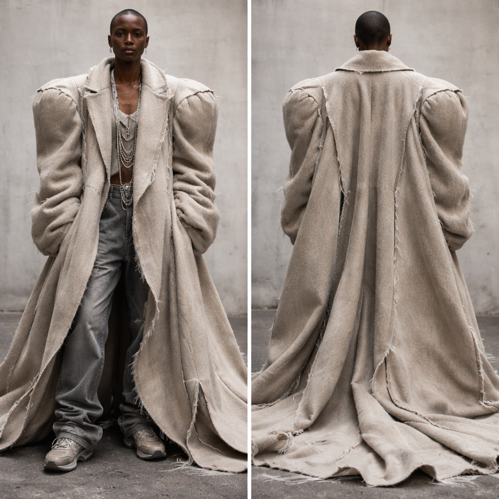 Silhouette and construction: extremely oversized, dramatic volume with exaggerated shoulders and a long, sweeping hem. Made from ultra-fine, expensive cashmere wool blend. Raw , unfinished edges and visible internal seams deliberately left exposed to show the ‘waste’ of luxury tailoring