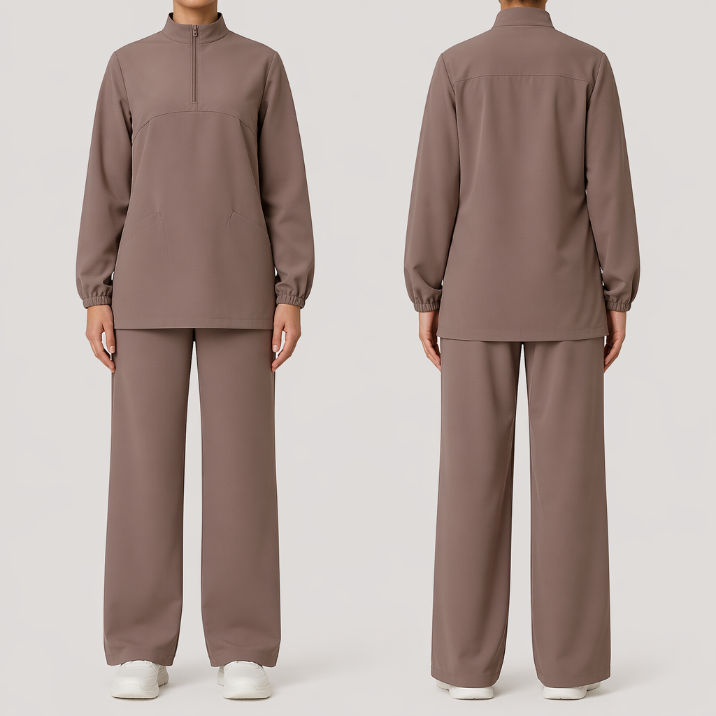 photorealistic fashion design, Modest scrub with high neck and half cup and wide leg The top lenght is about 80cm, just the design no text, show front and back