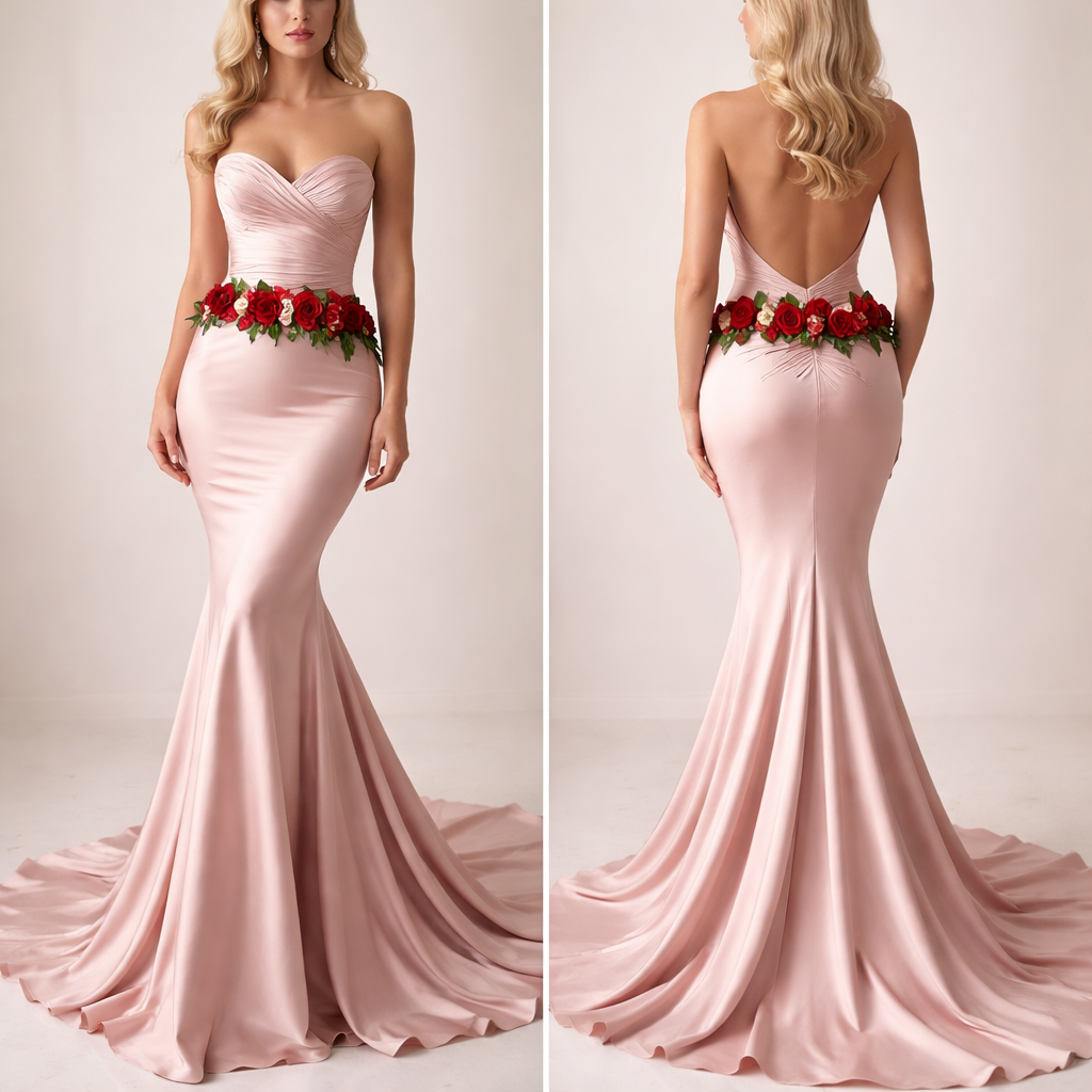 Silk light pink fabric, red rose with leaves around waist, mermaid shape, long dress, classic style, show front and back