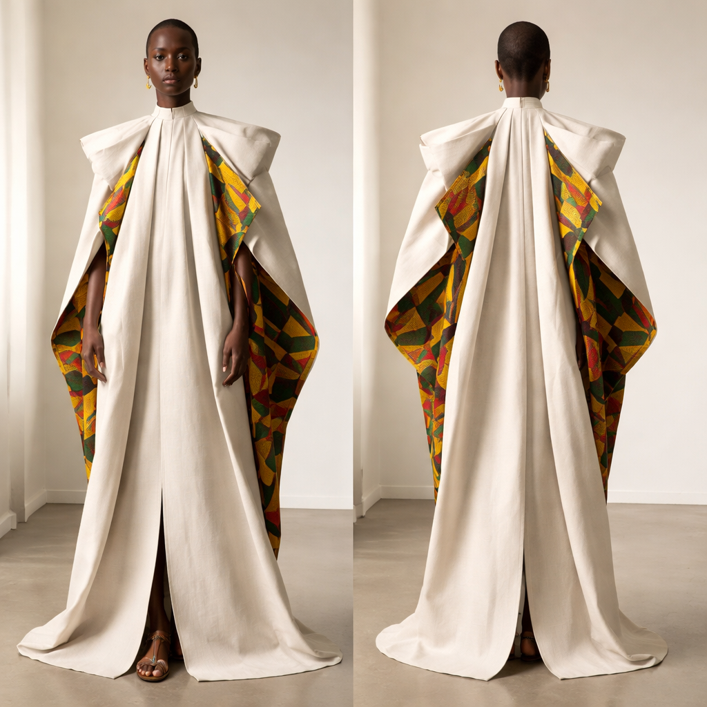 An avant-garde reinterpretation of the bubu. Floor-length with deep origami-style folds at the front and shoulders. Neck opening is small and structured. Fabric creates volume through folding, not looseness. Side slits hidden within folds. With linen and kente blend , minimalist style, show front and back