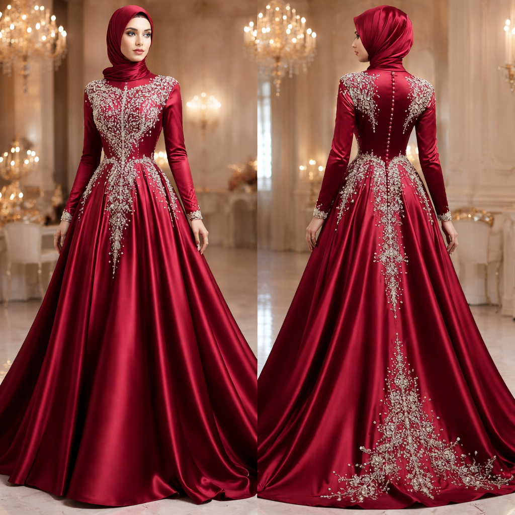 Design a hijab dress soirée in red satan with White pearl embroidery