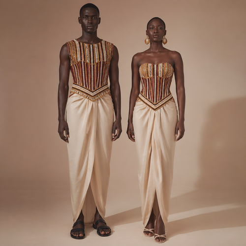 A Unisex Dress design, suitable for Spring. beaded corset dress. Ghana fashion aesthetics. Design with modest coverage.
