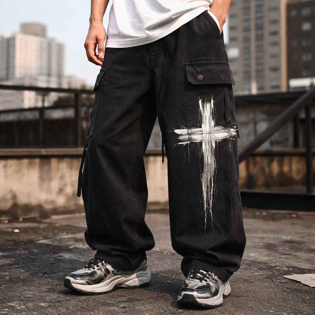 Taffeta silk cargo pants with a straight loose leg, no cuff, slight crop, mid rise (not high), and a drawstring waist