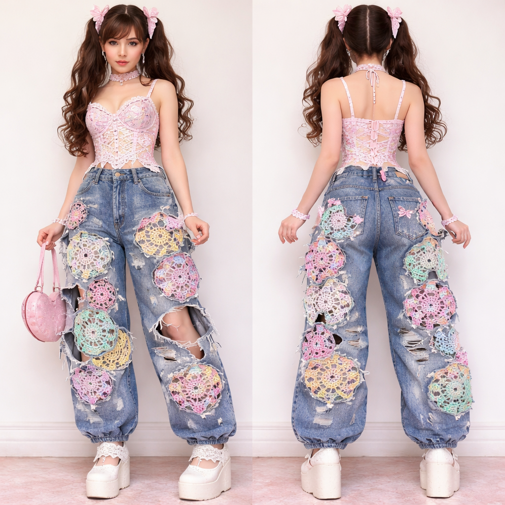 Upcycled jeans where crochet granny squares rupture the denim structure, wrapping asymmetrically around the leg, with distorted, deconstructed motifs that function as both ornament and structural repair. Barrel leg., lolita style, show front and back