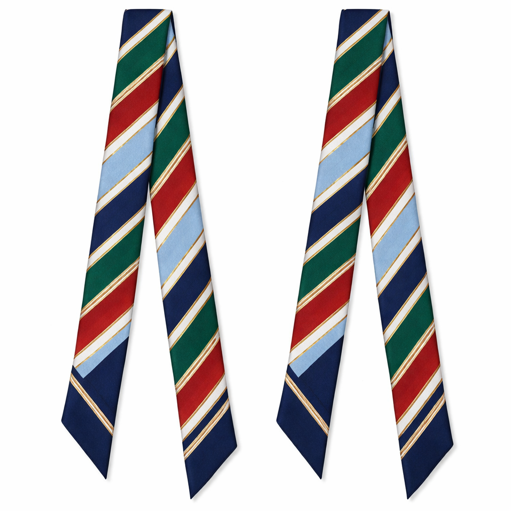 Design a silk scarf that is 5 x 86cm that wraps around a handle of a handbag Classic preppy stripe pattern with restrained color contrast, elongated for a narrow silk twilly, subtle ceremonial feel. Use world cup 2026 color combinations without the icon on the bottom both side have to be longitudinal, classic style, show front and back