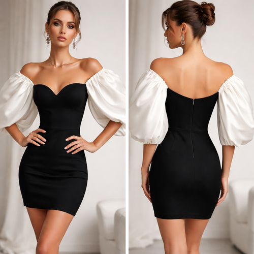 Fitted Luxury Short cotton black dress with full long white silk on full shoulder area