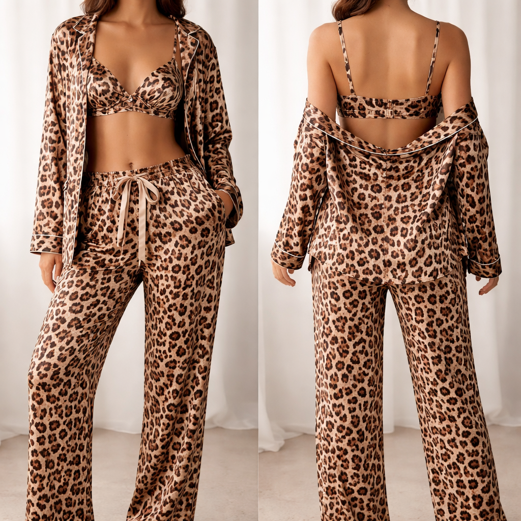 A brallete with only the straps on the shoulder also a pyjama pants and blouse in cheetah print. Kind of like a kind pyjama, sleepwear style, show front and back