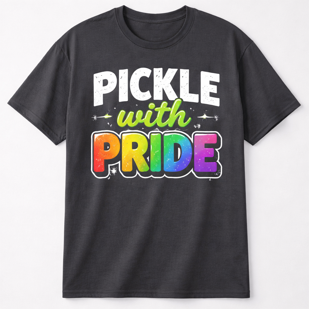 Charcoal grey unisex tee shirt Graphic on front- three lines first line- “PICKLE” in large capital block white text Second line- “with” lowercase in neon green chunky script Third line- “PRIDE” in rainbow gradient filled in capital letters
