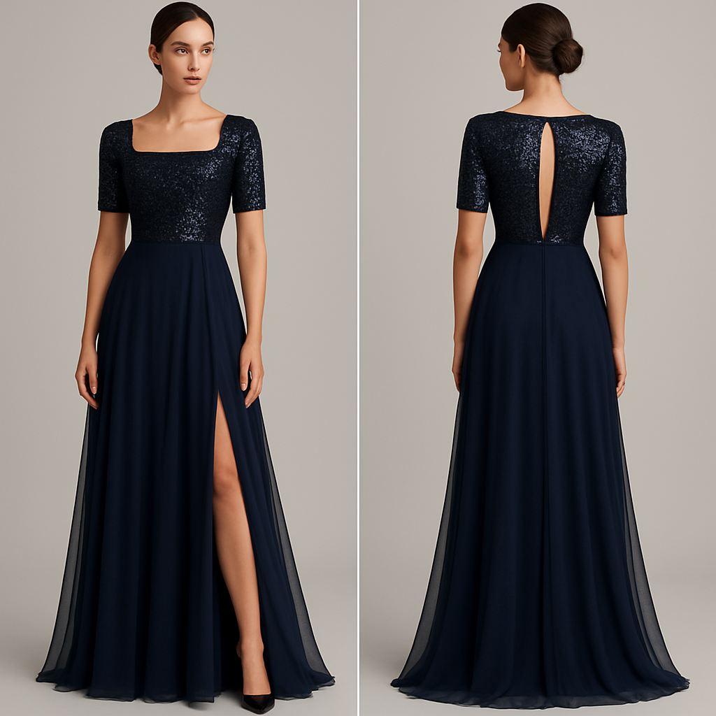 Se trata de un vestido largo de gala en color azul marino , de estilo elegante y moderno, con una combinación de tejidos brillantes y fluidos que crean un contraste sofisticado. La parte superior del vestido está confeccionada en tela de lentejuelas negras, que aportan brillo y textura. El corte del cuerpo es ajustado, entallado a la silueta, con escote recto y líneas limpias que realzan la figura. A este diseño se le deben añadir mangas confeccionadas con la misma tela de lentejuelas. Las mangas deben llegar hasta la mitad del brazo, con un ajuste cómodo y elegante, siguiendo la forma natural del brazo sin aportar volumen extra. En la espalda, el diseño incluirá una apertura central (una hendidura vertical) que comience en la parte superior y llegue hasta media espalda. Esta abertura debe ser discreta pero visible, aportando un toque sensual y moderno al conjunto. Se puede cerrar en la parte superior con un pequeño broche o botón oculto para mantener el acabado fino. La falda conserva el diseño original: larga, de tela ligera de gasa o tul negro semitransparente, que cae desde la cintura con un movimiento fluido y elegante. Puede incluir una abertura lateral que deje entrever la pierna al caminar, añadiendo dinamismo al conjunto. En conjunto, el vestido mantiene un equilibrio entre el brillo sofisticado de la parte superior y la ligereza etérea de la falda, ideal para eventos de noche o de gala., show front and back